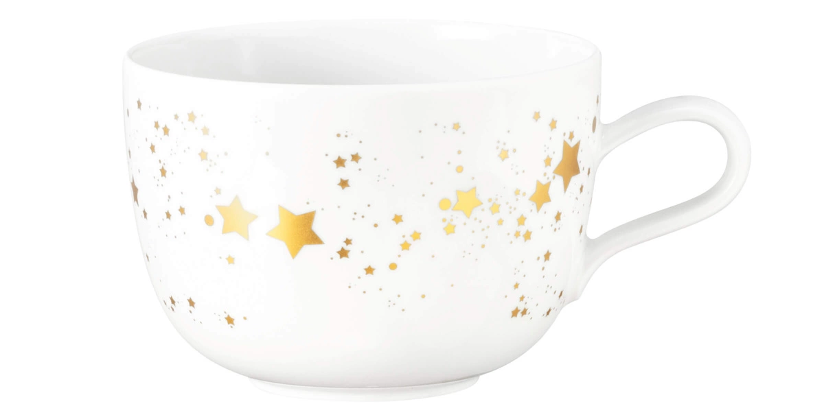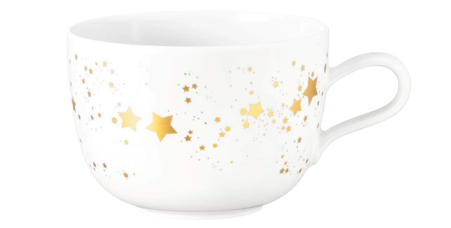 Na śnieżnobiałej porcelanie umieszczone są delikatne, złote gwiazdki, które subtelnie połyskują w świetle, dodając wyjątkowego blasku każdemu spotkaniu. Dzięki swojej harmonijnej formie oraz lekkości, filiżanka nie tylko zachwyca wyglądem, ale także jest niezwykle praktyczna w codziennym użytkowaniu.