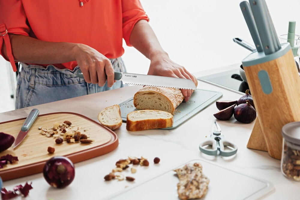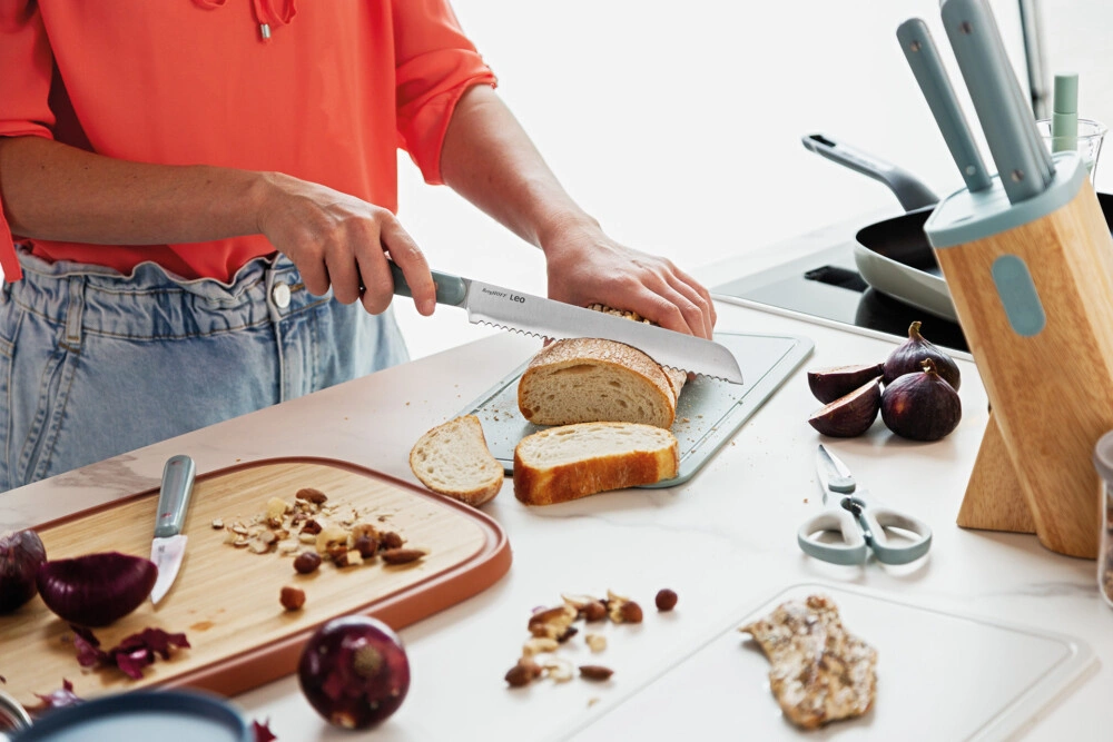 - Specjalnie zaprojektowane ząbki, które ułatwiają krojenie twardych skórkach bez miażdżenia miękkiego wnętrza.