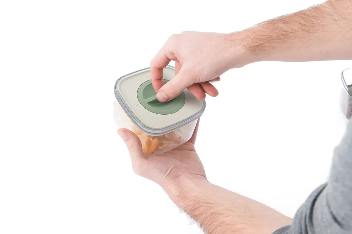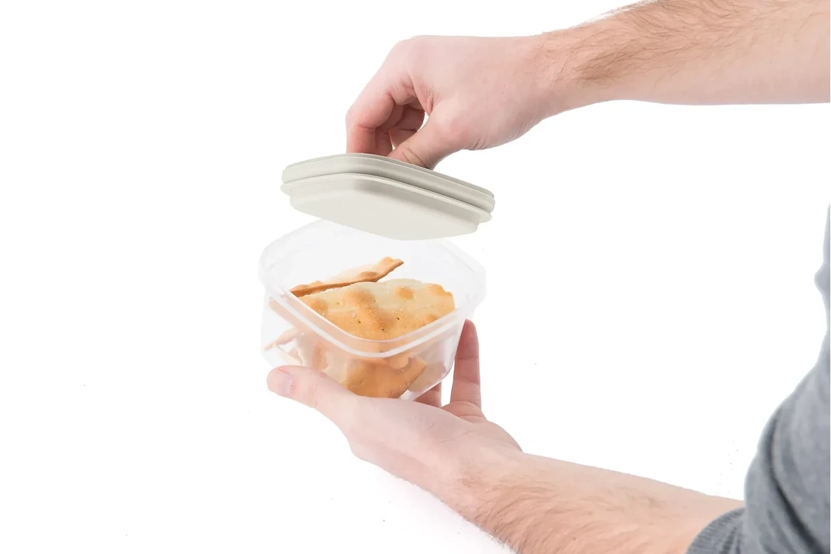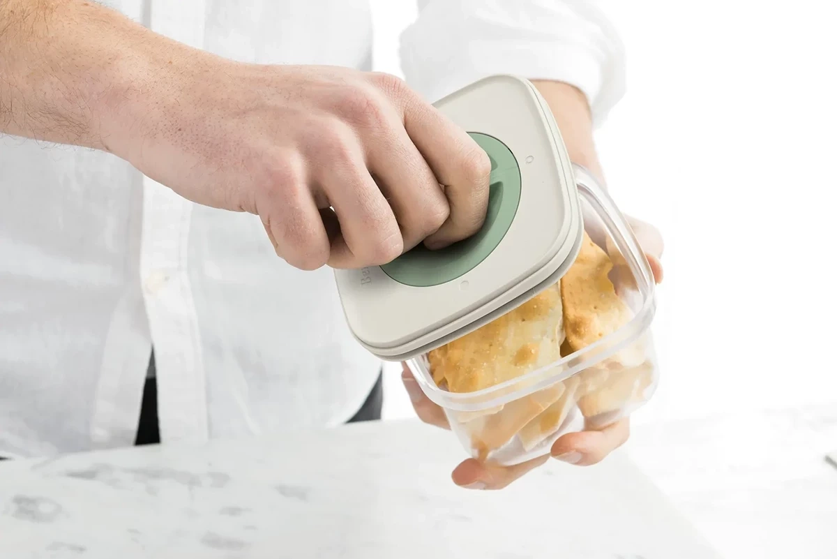 Pojemnik Smart Seal został wyposażony w hermetyczne zamknięcie, które zapewnia idealne warunki do przechowywania żywności. Dzięki łatwemu w obsłudze zamkowi obrotowemu, możesz być pewien, że Twoje jedzenie jest zawsze dobrze zabezpieczone przed dostępem powietrza i wilgocią.