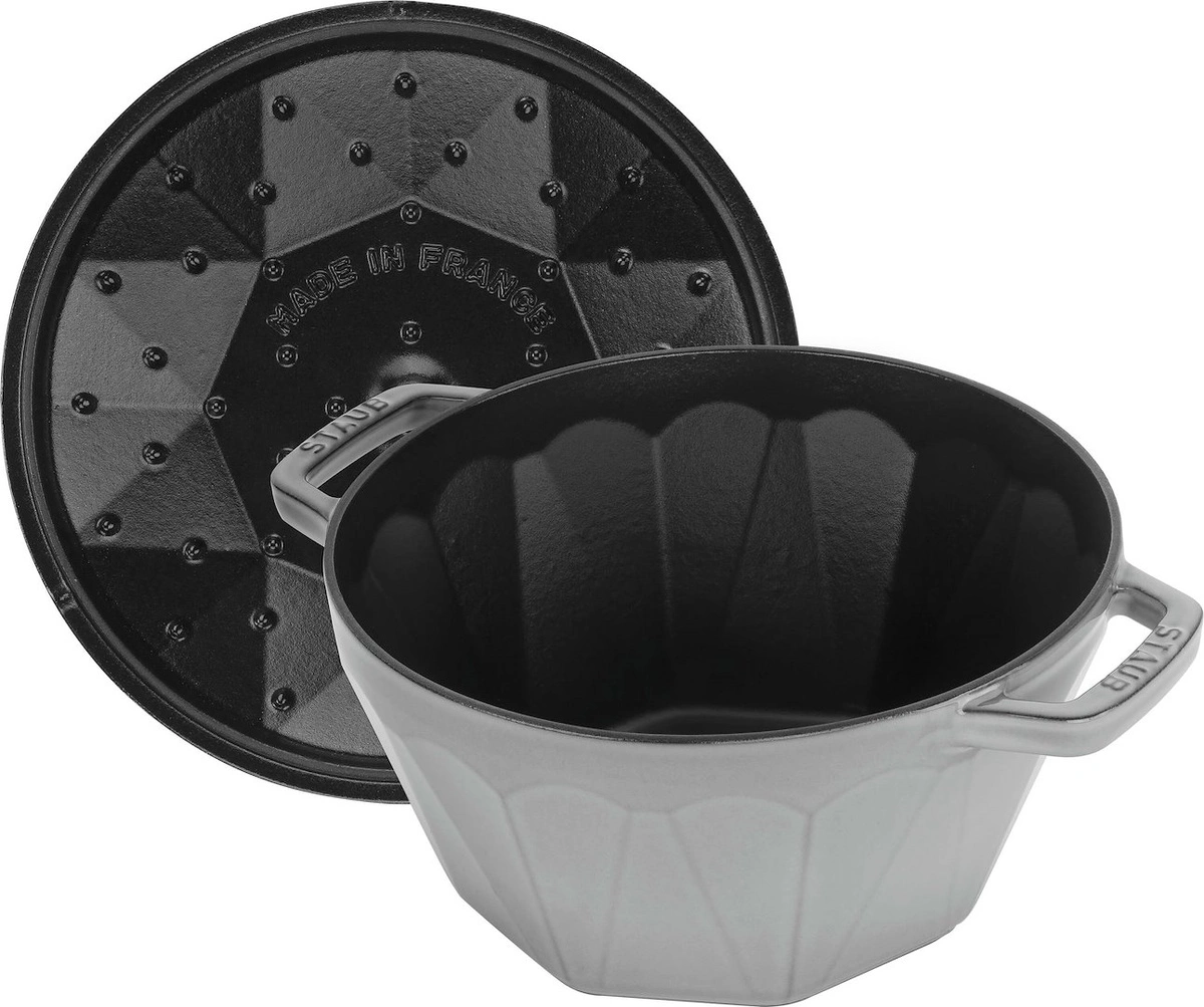 Staub Special Cocotte to nie tylko garnek, to prawdziwe dzieło sztuki kuchennej. Jego unikalny diamentowy kształt oraz elegancki, szary kolor przyciągają wzrok i dodają klasy każdemu wnętrzu. Został zaprojektowany z myślą o miłośnikach gotowania, którzy cenią sobie wyjątkowe naczynia, które nie tylko spełniają swoją funkcję, ale również stają się ozdobą stołu.